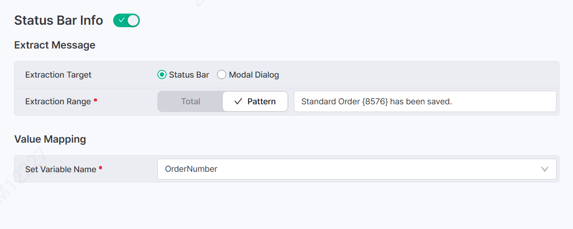If the Status Bar message does not follow a simple pattern and {} alone is not enough to extract the value, you can use a Script Step to apply JavaScript logic for more flexible extraction.